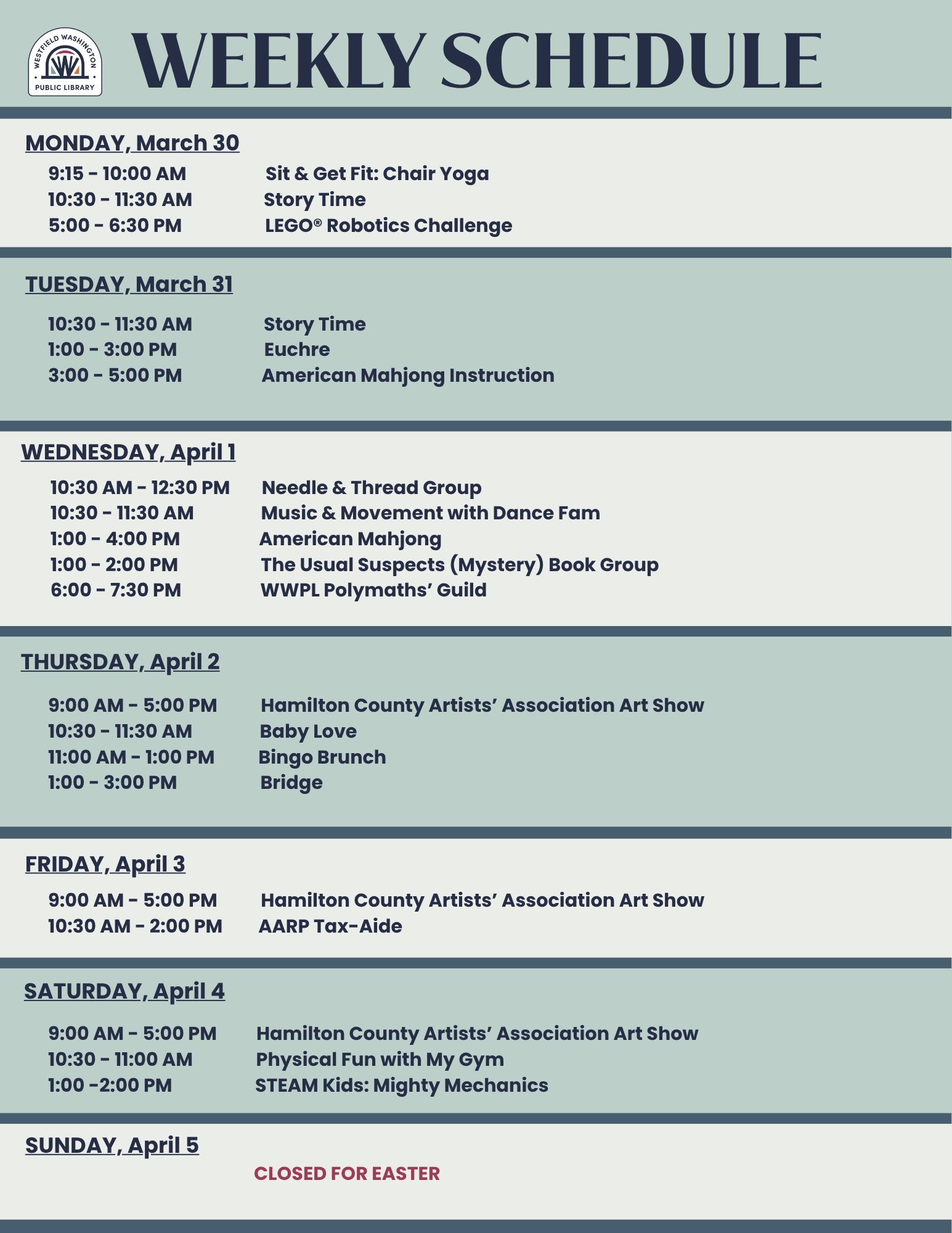 The library will be closed on Sunday, April 5, 2026, for the Easter holiday. Remember that our online resources remain available, even when our building is closed.